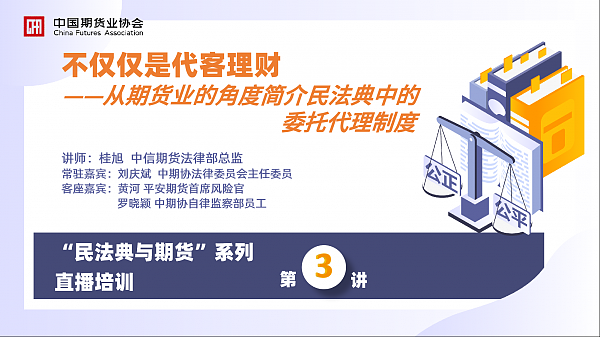 讲师:桂旭 中信期货法律部总监常驻嘉宾:刘庆斌 中期协法律委员会主任委员客座嘉宾:黄河 平安期货首席风险官 罗晓颖 中期协自律监察部员工