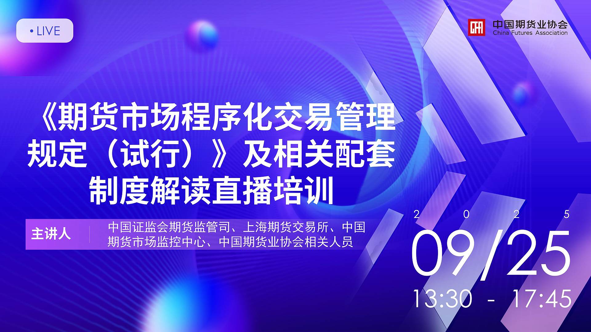《期货市场程序化交易管理规定(试行)》的起草背景、重点条款解读及后续工作安排;《上海期货交易所程序化交易管理办法》解读;中国期货监控程序化交易报告系统使用简介;《程序化交易委托协议文本(必备条款)》解读;《期货程序化交易系统功能测试指引》(T/ZQX 0004-2025)。